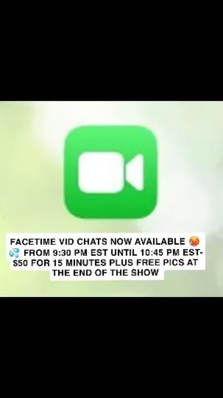 (ONLY ASK ABOUT MY FACETIME SHOW )FACETIME VID CHATS NOW AVAILABLE β€MESSAGE ME FOR AVAILABILITY - $50 FOR 15 MINUTES PLUS FREE PICS I SEND AT THE END OF THE SHOW FACTIME SHOW FROM 12:00 PM EST UNTIL 1:30PM AND AGAIN AT NIGHT FROM 9:30PM UNTIL11PM MUST HAVE APPLE PAY SPOTS ARE LIMITED AND I HAVE VERIFICATION PICS IN THE AD FOR A REASON SO DONT ASK FOR ANYTHING OTHER THEN FACETIME SHOWS MUST HAVE FACETIME APP ON IPHONE ONLY AND ABSOLUTLY NO MEETS SO DONT ASK MESSAGE ME ABOUT ANYTHING OTHER THEN VID CHAT U WILL BE BLOCKED