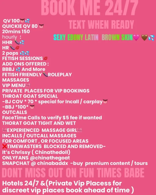 ⭐Top Tier Non rushed 5 star service ⭐ Throat Goat 👅💦 Tight and Wet 💦 MENU: text when ready QV 🍆💦 HHR /HR💦💦 BJ /BBJ👅🍆 MASSAGES HAPPY ENDING👅 RIM JOB 💦 GFE FETISH FRIENDLY 👅🍆 👅doggy , 69 , rimming , facials add on fee 🍆 🥂ASK 4 VIP MENU-for private sessions/places- OUTCALLS/OVERNIGHT💋(deposit or no reply) my site : https://msha.ke/thedollbookings MY VIDS ONLYFANS💦🍆@mamithegoat Timewasters get blocked /Lowballers removed • no rushed session • 24/7 text to book name : china / chrissy